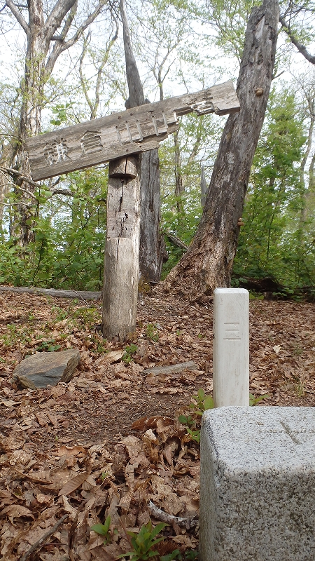 山頂は広葉樹に囲まれた広場の真ん中に三角点標柱。樹木のせいで眺望はイマイチだけど、新緑と青空のもとで雰囲気は良い。山頂から北へ少し下ればもっと素晴らしい雰囲気ですよ。次回はぜひ。