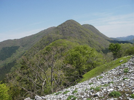 振り返ると、これから向かう鈴ヶ岳が両肩に鈴北岳(左)と御池岳を背負う様に見えていた。