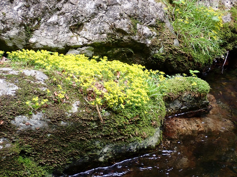 今日は風折滝の水量も多く折れる気配はない。沢筋の岩には密集した緑の茎にヒメレンゲの黄色の花が咲き清涼感を増している。風のある日は滝口から流れ落ちる水滴がミストになって下流に流れてくるが、これもないので風が吹いていないのだろう。