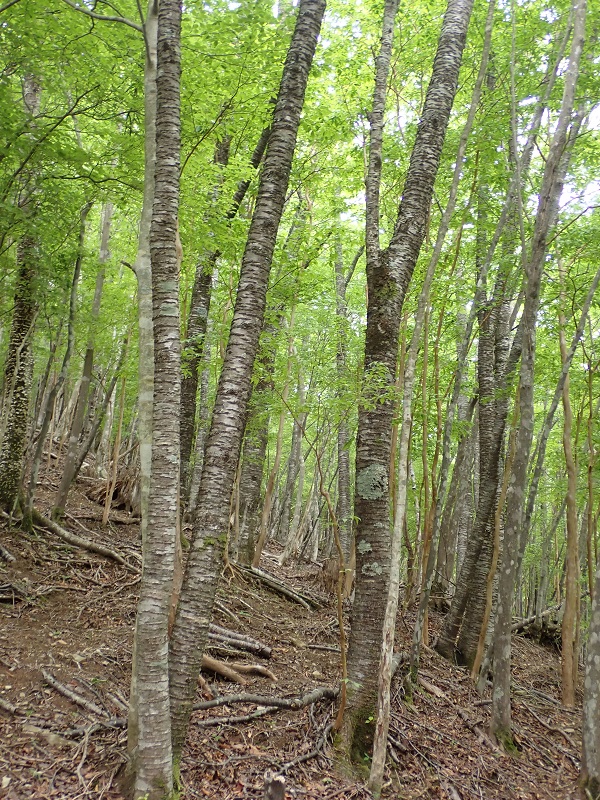 山桜の木はすごい数で、遠く離れた天井桟敷からも見えるはずだ。ここは下草もなく、さぞかし山桜の時期には華やかな桜の園だろう。背の高い山桜は下から見上げても空の明るさに吸収されて絵にならないです。