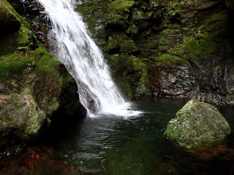 宮ノ谷駐車場から宮ノ谷を進み風折谷に入る。ここはヒルの巣窟で、夏場に入ると大変だ。ヒルが出始めているので、前日にヤマビルファイターを買いに行った。この日も、出会ったので息を吹きかけると元気に動き回っていた。アトラクションを4つこなして風折滝に着いた。