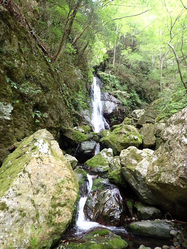 宮ノ谷駐車場から宮ノ谷を進み風折谷に入る。ここはヒルの巣窟で、夏場に入ると大変だ。ヒルが出始めているので、前日にヤマビルファイターを買いに行った。この日も、出会ったので息を吹きかけると元気に動き回っていた。アトラクションを4つこなして風折滝に着いた。