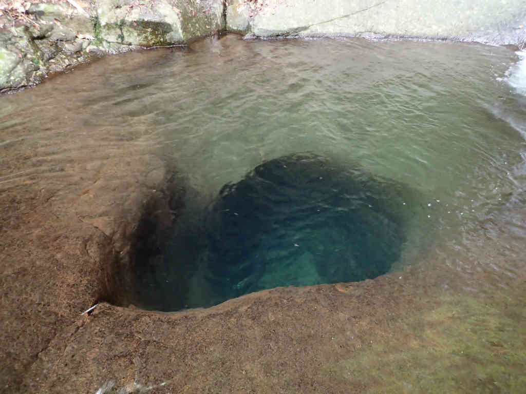 下段はフリクションをきかせて登りきる。下段と上段の間の小さな釜には甌穴(ポットホール)があった。いかにも深そうだ。固い岩盤をここまで掘り下げるのにどれくらいの時間がかかったのだろうか。 上段は傾斜がきつくなり,登れそうにない。もし滑れば甌穴にそのまますっぽりはまりこみそうだ。幸い,滝のすぐ横に木が生えているので,滝の右側を流れを眺めながら小さく巻き登ることができた。 滝上はまるで舗装道路のようなナメが続いている。こんな綺麗なナメは滅多にあるもんじゃない。至福のナメ歩き。左側から流れ込む支谷の滝もナメ滝だ。綺麗なナメは100mほど続き,3mほどのナメ滝を登ると東海自然歩道が横切り,そこで終了していた。 2mほどの滝があり,そのすぐ後ろに小規模な山抜けの跡と思われる岩の堆積があった。その後,沢はすっかり源流の様相となり,大人しくなる。自然林であれば癒しの渓だろうが,残念ながら両側は植林である。このまま進むと住塚山と国見山の間の鞍部に突き上げるようだが,行く価値はないだろう。引き返すことにする。
