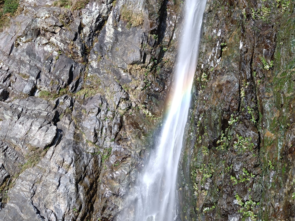 滝の中ほどに掛かった虹からは虹色の飛沫がきらめきながら舞っていた。