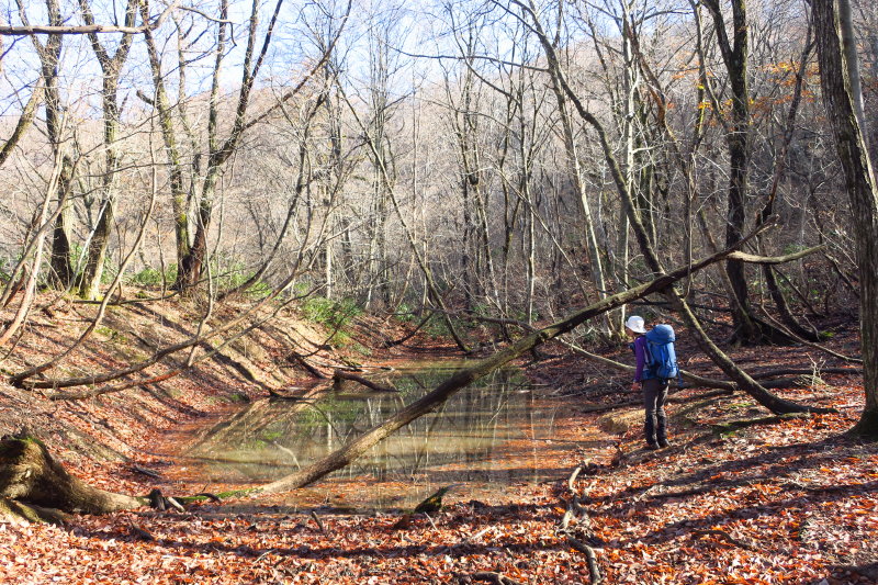 牧谷川左岸尾根も快適でしたね。・468先の窪地に、ふたつの池を目にした時は、こころ躍りました。岸辺に行かずには先に進めませんでしたね。