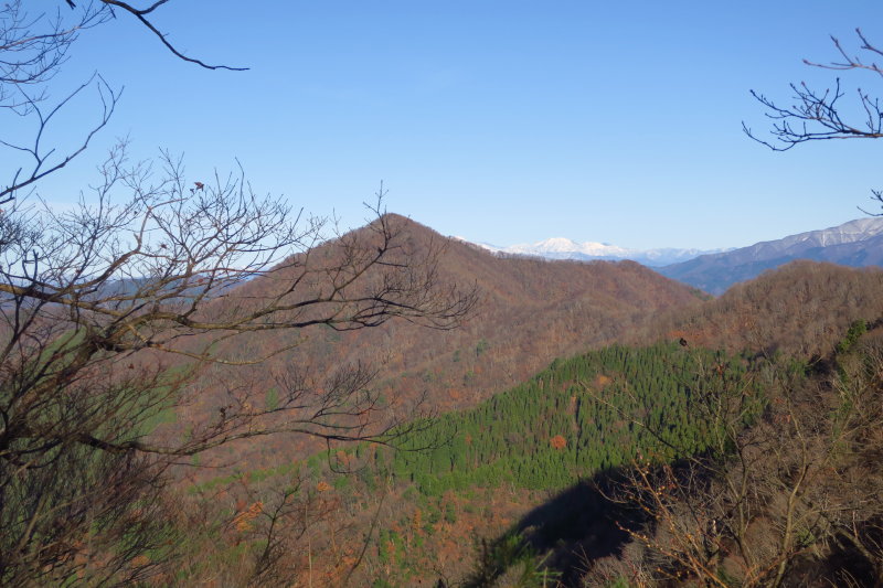右手に白く冠雪した山が見えた。特徴的な台形の山頂部は部子山と銀杏峰だ。1000mを超える多くの山がよ