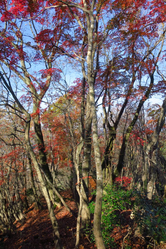 稜線までの標高差は250mほどしかない。空が近付いてくると、赤や黄色に彩られた林が浮かび上がってきた。