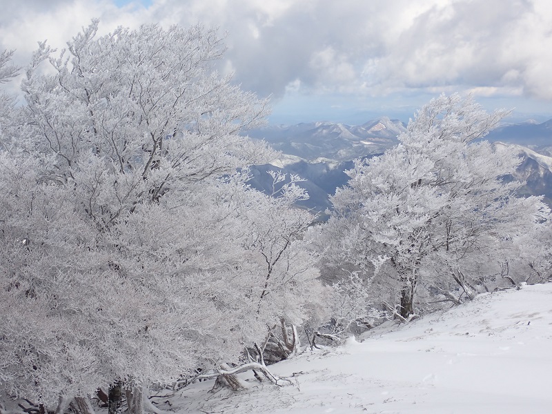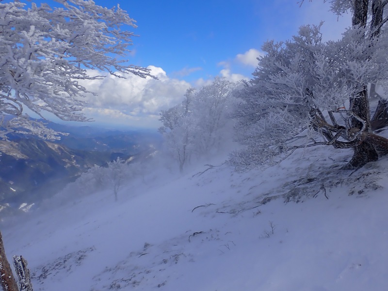 飛ばされないように風をよけながら登り切ったころに、三重県側のみ雲が取れてきた。高見山から連なる山々も珍しく雪に輝いている。稜線は霧氷の森で青空とのコントラストは美しいというしかない。稜線
