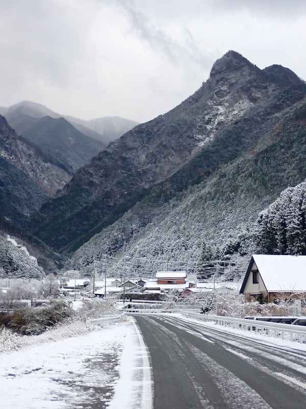 飯高に入ると銀世界で、里では初雪のようだ。森の集落は雪国のようで、竹が雪の重みでしなって道路にはみ出している。