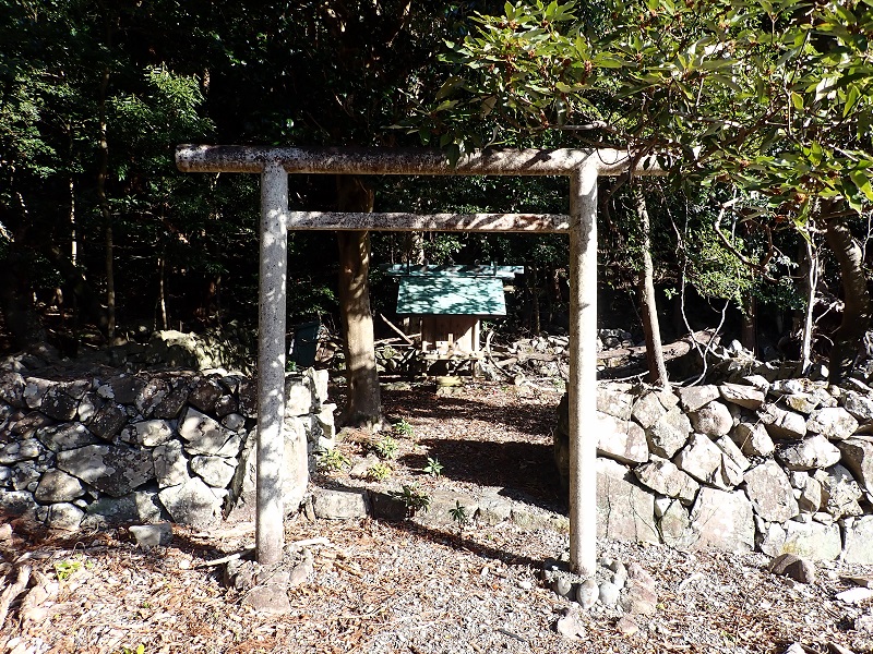 須賀利の普済寺方面に向かう。本堂はマグロ・カツオ漁で港が賑わっていた文久元年(1861)に再建されたもので、大工の棟梁は名古屋の竹中和泉(竹中工務店の祖)が請け負ったそうだ。寺にはマグロ供養塔が残っている。ここから寺倉峠へ向けて道が続いている。津波の避難路に沿っていくと自然とつながった。立派な石積みの九十九折の道が続いている。ただ、まったく使われていないようで、道には倒木が放置されシダが生えている。登り口には不動明王を祀った小屋がある。シダコギをしながら峠が近づくとプラスチックで作られた鳥居と神社の小屋があるが、中は見えない。