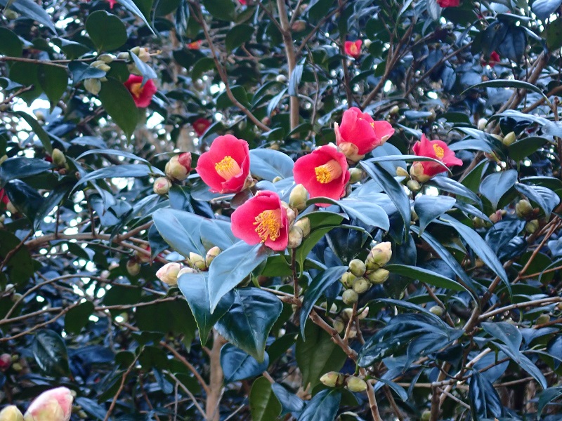 江戸鼻に御挨拶をして池の南側の道を進む。こちらの方が石積みも残り歩きやすい。椿の花が見ごろで美しく、赤い実をつけた万両も多い。神社から来た道を戻る。分岐から稜線を進み日和山に着くと四角く石で囲まれた狼煙台がある。須賀利の老人に聞いたところ、幕末に外国船を見張ったようで、島勝にもあると教えてくれた。須賀利の12時の時報「尾鷲節」のメロディがまじかに聞こえる。kitayamawalkeさんの標識に別れを告げ、下山路を思案する。東紀州の山だけに植林地もシダにおおわれている所が多く、へたをするとシダのヤブコギになりかねない。P240から北西に降りる尾根に踏み跡があるのでここを下る。テープもあり杣道として使われているようだ。末端で右の谷に下り、シダコギをすることなく網小屋の前に軟着陸できた。