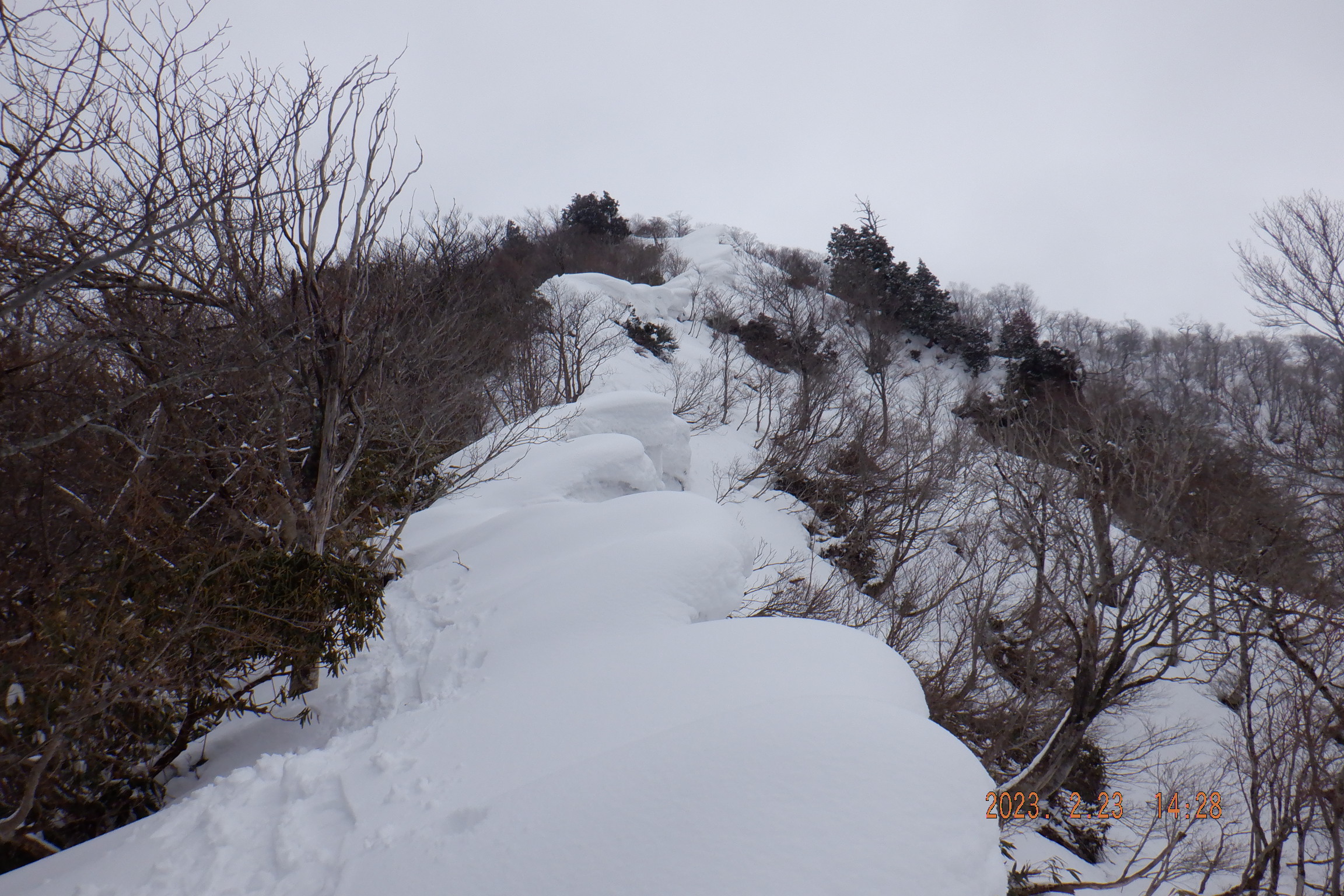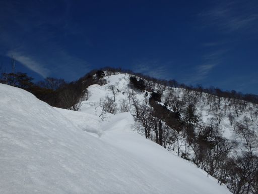 そこからまた雪庇を越えることになるが前回のように恐怖は感じなかった。それでも時折微妙な感じの雪庇は藪の中に逃げたり戻ったりした。