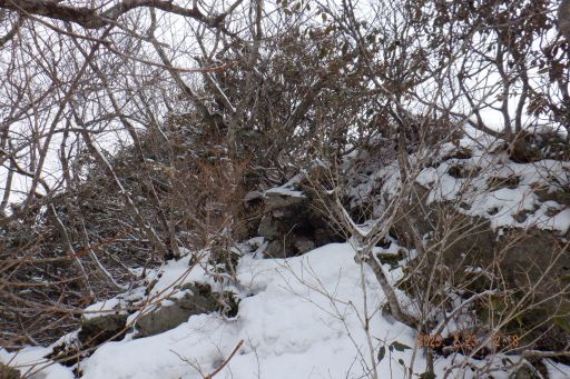 登り口から九十九折の道を登って行き、ここが終わると直登道になり、どんどん登って行くと雪交じりの藪になるがなかなか煩い。