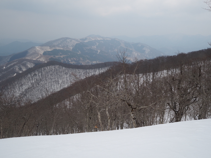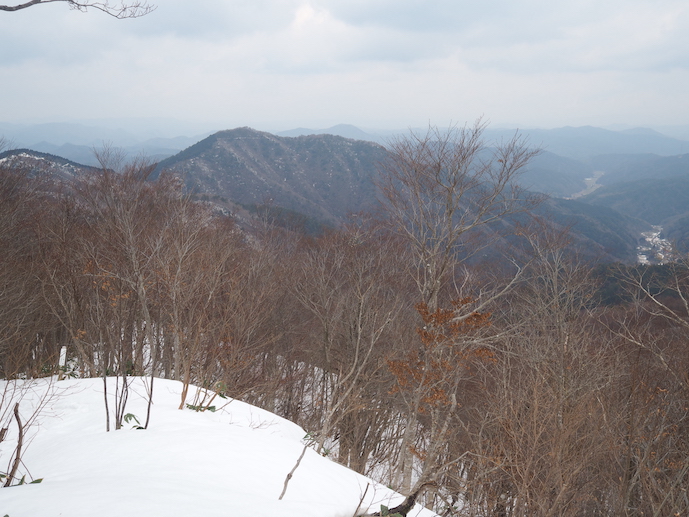 トレースを辿ると大きな林道に出る。無雪期にはこの道路のおかげで稜線まで車での上がれてしまうらしい。林道からはわずかにひと登りで稜線に出る。地蔵堂のある展望台からは北東に大きく展望が広がった。すぐ北に見えるのは等検鏡という山らしい。晴れていれば宍道湖が見えるようだが、生憎この日は空気が霞んでいる。