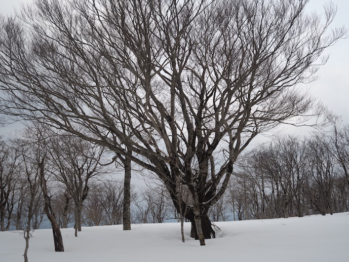 次ついと現れるブナの大樹の佇まいに魅了されながら、県境稜線を進むうちに雲の合間から樹林に陽が差し込み始める。広々とした雪面に描かれる樹々のシルエットを眺めるのはなんとも愉しいものだ。