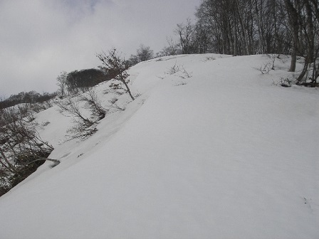 尾根は段々細くなり片流れの急斜面に出た。ここは怖いので一気にガーッと行かず板を斜めにずらし気味にして慎重に下った。