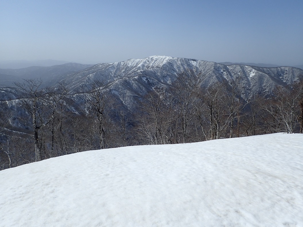 標高680mぐらいから一面の雪となり、スノーシューを装着。天気が良く暑いぐらいだ。標高が上がってくると、ブナの林となる。そして県境稜線手前からは広く展望が開けた。 稜線に出て、「あれが三国だよね」と確認するが、ずいぶん先である。しかし、展望の広がる別天地のような尾根をサクサクと進むと、案外早く近づいてくる。 三国岳の山頂は広く、遠方はやや春霞だが、360度の大展望である。ペースの遅い山友には、県境稜線に出る手前で「先に行って左千方に行ってくる」と言ってあったので、ピストンした。左千方頂上も素晴らしい展望だ。足元の谷までよく見えるので、むしろ三国の頂上よりも展望が良い。上谷山は格好いいが、三国岳は、山というより丘のような感じで見栄えしない。三国岳に戻ってランチをしているときに、山友が合流した。ランチを済ませて縦走を再開する。 夜叉丸までの途中の夜叉ヶ岳(P1206)に来ると、樹間から見る夜叉丸への尾根が尖っていて、雪割れもある。行けるのか心配になったが、近づいてみると何の問題もなかった。夜叉丸も360度の展望。三周ヶ岳が近くなった。 夜叉丸からは、岩谷川林道の終点への尾根を下った。心配した山友は、遅れながらもついてくることができた。結局、全線にわたり誰にも会わなかった。