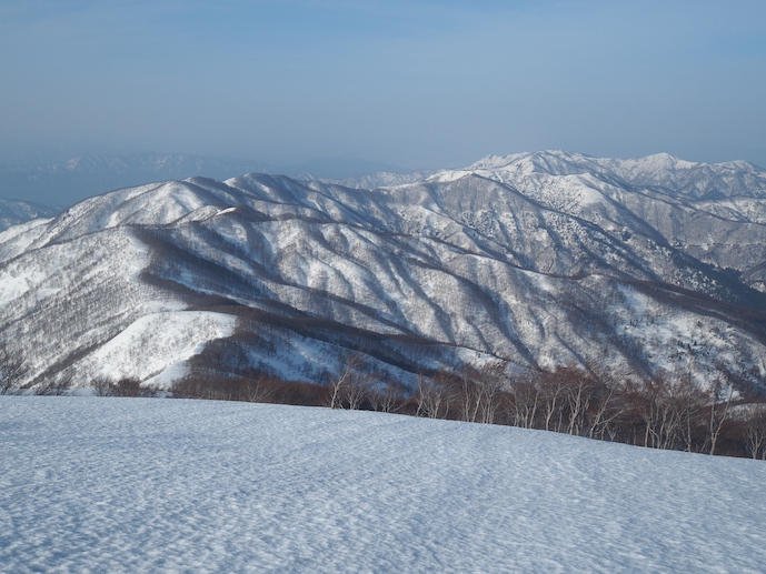 雪原から緩やかに斜面を登り、みつまた山のピークに立つ。云うまでもなくみつまた山はジャンクション・ピークの意味だ。山頂から高平山を経て浄法寺山から続く長い稜線が視界に飛び込む。振り返ると加賀甲からここまで延々と辿ってきた国境稜線を俯瞰することが出来る。加賀甲から眺めた時には非常に長大に思われたが、ここまでほぼ3時間の行程だった。