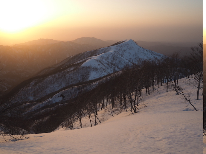 大日岳の山頂が近づいたところで夕日が日本海に沈んでゆく。水平線の上がうっすらと灰色の帯がかかっているように見えるのは黄砂のせいだろう。黄砂がなければもっと綺麗に空が茜色に染まるのだろうが、そんな贅沢を言っている余裕はない。大日山の山頂は広々とした雪原が広がっている。東側には越前甲へと続く稜線が残照を映して青く染まっている。山頂を後に避難小屋のある加賀甲に向かうと急速に夜の帷が降りてくる。