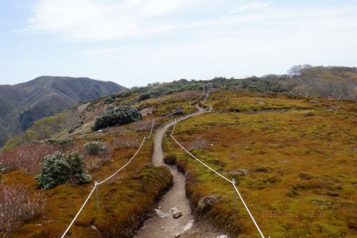 苔むした台地になっているイブネの真ん中に30cm幅の苔がなくなった登山道が繋がっている。