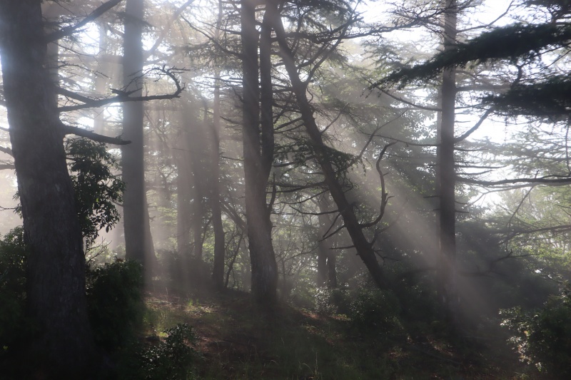 赤ゾレ山に着くと、朝霧がかかっていた。展望のいい山だが、今は霧が立ち込めていて何も見えない。柔らかな朝の光が広がる。美しい木漏れ日だ。