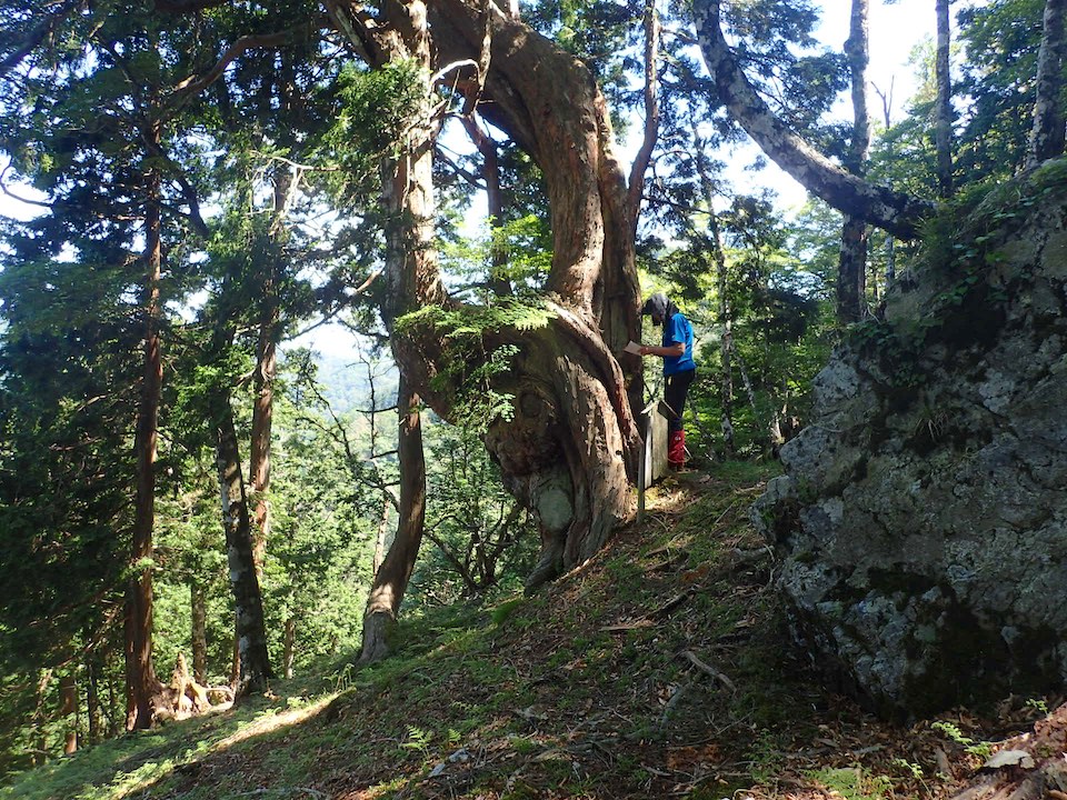 地図とコンパスを見ながら適当に下ると、踏み跡っぽいものがあった。そこを辿ると下に大きな桧があった。そばまで行くと「千秋社 御神木」の立て札が立っていた。やった!まずは御神木が見つかった。ありがたい。