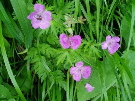 シナノキンバイにグンナイフウロと夏山のスターを集めた豪華な面々の歓迎を受けた。昔池山尾根を下った時はヒュッテから尾根道を下ったのでそれほど花も見られず寂しい尾根の印象しかなかったので嬉しい誤算だ。