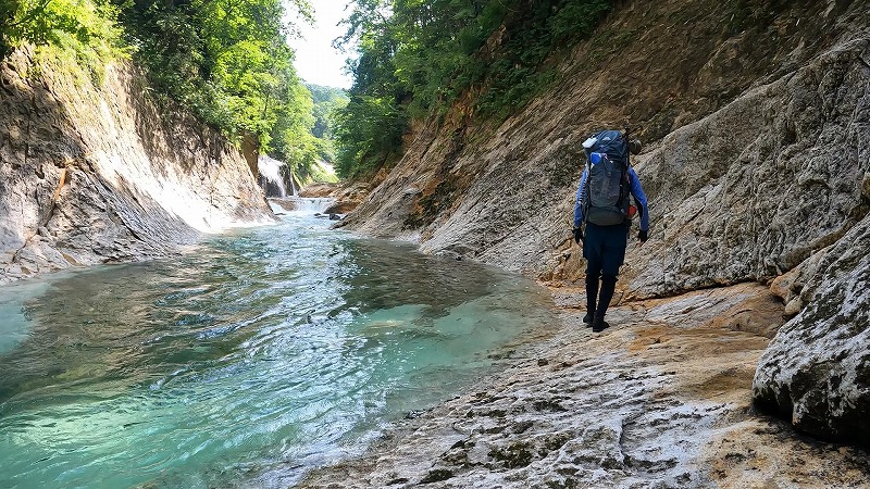 初日の核心部は「お函」と呼ばれているゴルジュ帯ゴルジュと言っても開けたU字型で明るく、流れ際を快適に歩け気分は最高潮だ。