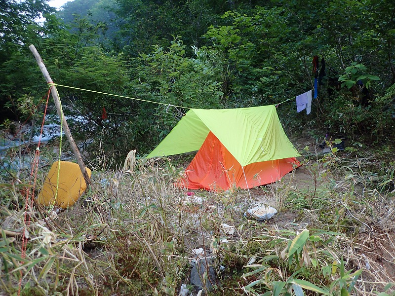 お函を過ぎると大石沢出合は目前だ。流れが重いので一旦大石沢に入ってから戻ってコンパクトな二俣台地にツェルトを張った。