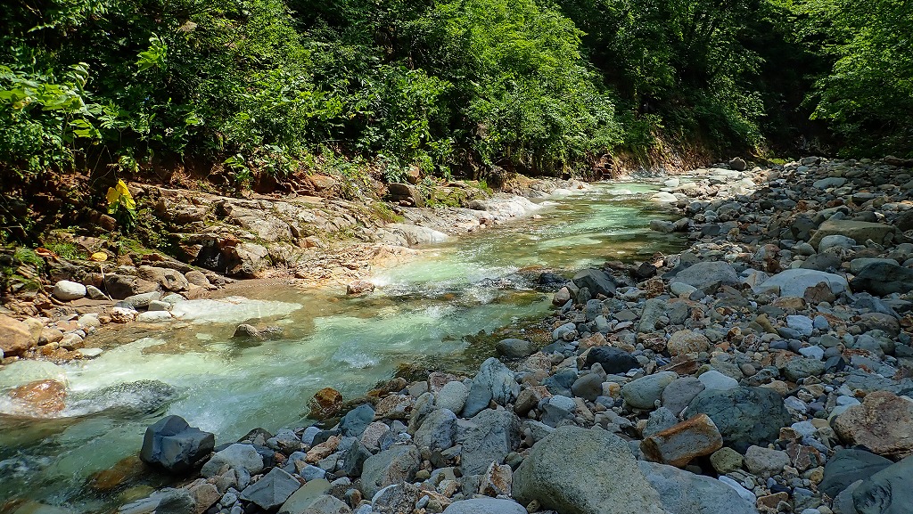 お函のようなゴルジュはないが、簡単に登れる滝、美しいナメや淵、白い川床の緩やかな流れと河原など、もちろん水はエメラルドグリーンで森は豊かで極上の川歩きだった。