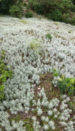 登山口から1時間ちょっとで稜線に出る、そこから少し歩いた右の斜面のホソバノヤマハハコの群生地がある。