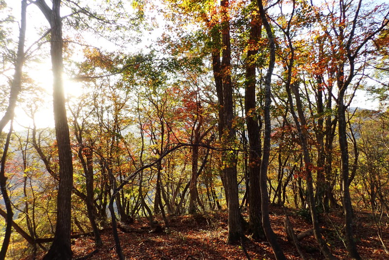 小原へと下る尾根はカエデも多く、赤や黄に彩られた木々が、午後4時前の黄味を帯びたやわらかな陽射しを受け、艶やかに煌めいていました。この時間から、そう、「日の沈む前の一瞬の光芒」、秋のお山の味わい深き時間です。