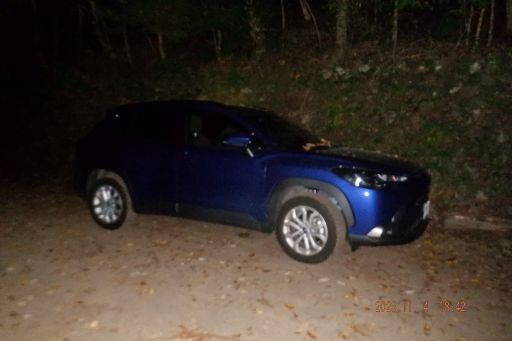 最後の下りは急で踏み跡程度らしく暗くなる前に通過したかったですが、これから下降と言う時にとうとう闇下に('Д') 最悪のパターンですが経験はあるのでヘッデンを用意して、慎重に 下って行きますが途中右に折れる地点も迷って、最後の最後で踏み跡が消えて焦ります。 ナビ通りに行こうとしても小さい谷筋があり下りられません。最後は自分でルーファイするしかなく右方向に活路を求めて、やっと道路に下りられました。