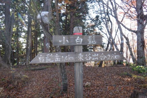 谷道から尾根に上がると植林体が終わり自然林となって明るくなった。急な登りが続くが我慢して登って行くとやっとのことで前山の小白髭に着いた。しかし、ここからは展望は良いものの何度もアプダウンが続き長かった。南側は切原からショウジ山の尾根が良く見えたがここからあそこを周回するのかと思うととても長く感じた。