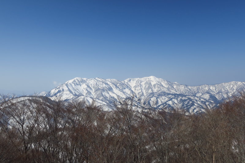 北側斜面の美しいブナ林を愛でながらジャンクションピークに立つと、越前甲と加賀大日山の姿が迫る。