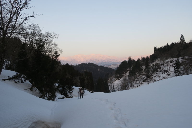 少し薄暗くなりかかった林道を歩いていると、正面に見える白山が茜色に染まっていた。