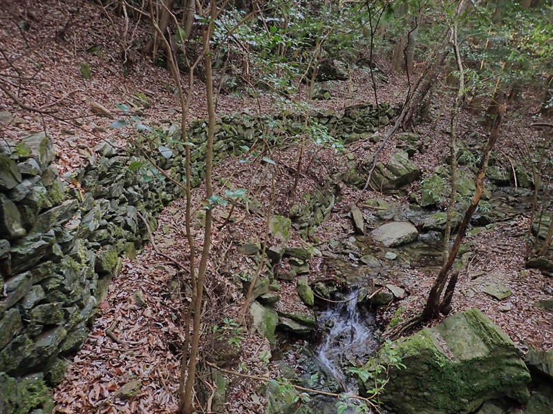 来た道を上り返していると桜吹雪が舞っている。山桜が散り始めており山桜が花盛りで桜の絨毯が出来始めている。相津峠を越え取りつき地点の溝道を追うと谷と尾根の間を下っている。下るにつれヤブが溝道をおおうようになるが林道の沢筋までつながった。取りついた場所の近くで尾根に上らずに谷沿いに上っていけば溝道につながったようだ。林道を下り杣人と話していた時に、伐採地の外れの石垣が古道の石積みと同じなのに気づいた。この石積道は相津までつながっており、現在はプラスチックの導水管の道になっている。
