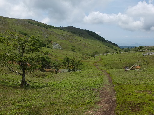 ゴツゴツした岩稜を歩いた後は緩やかなカルストの草原を下って行くこの舞台の転換は賽の河原を歩いた後に極楽にたどり着いたような気分になります。先人たちもここを聖なる地として崇めたのももっともでしょう。