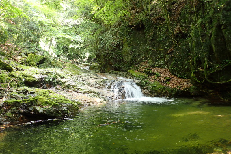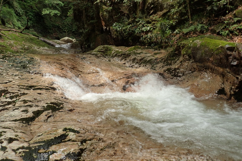 きれいな淵を見ながら谷は90度右折して、左岸を岩壁に守られた美しいナメから1mも無いような落差で、小さな