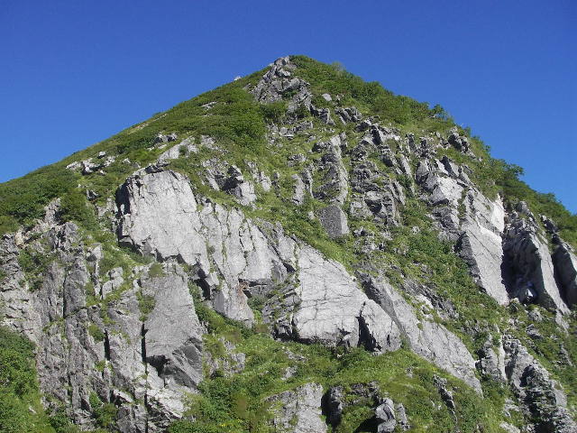 ガレ谷が終わり草原が広がって青空と美しい対比をなしていた。