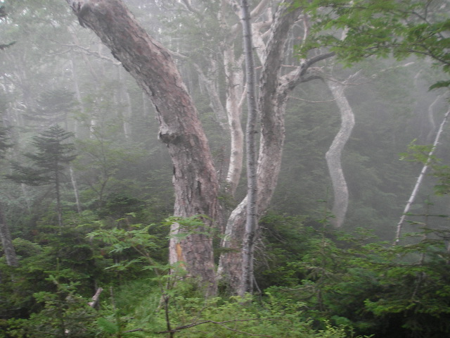 しかし赤沢の頭まで1kmの標識から傾斜は緩くなりダケカンバの変珍木を過ぎると平たんになって赤沢の頭に着いた。