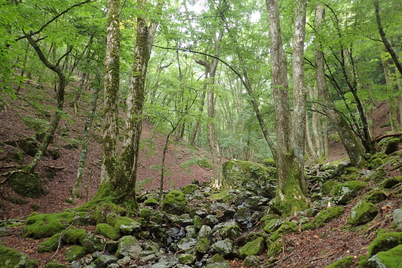 しばらく植林のゴーロを進んでいると、不意に植林が切れて再び自然林の谷となる。