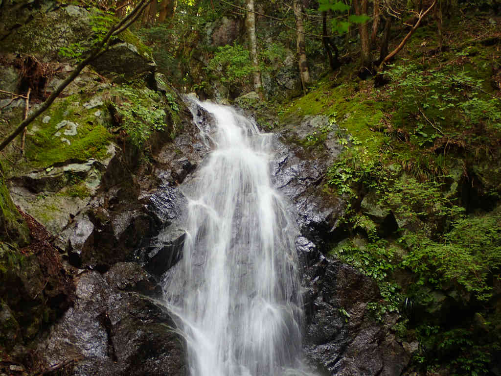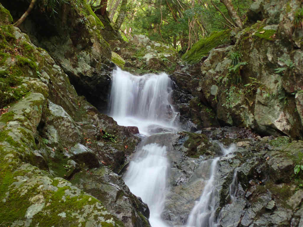 月出の入渓口のすぐ南には中央構造線の露頭があり,中央構造線の北側の地質は花崗岩からなっているとされる。確かに,ワサビ谷の一部には花崗岩らしい岩もあるが,大部分は黒くて固い岩石でできている。ネットで調べてみると黒色片岩と呼ばれる変成岩の一種のようだ。確かに大部分の滝を構成している岩石は黒っぽく,暗い谷をさらに暗くしている。黒色片岩は固いので水流による風化がしにくく,固い岩盤が滝となって残ってきたものだろう。
