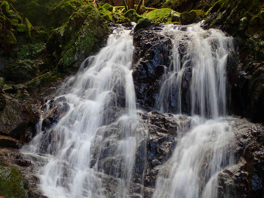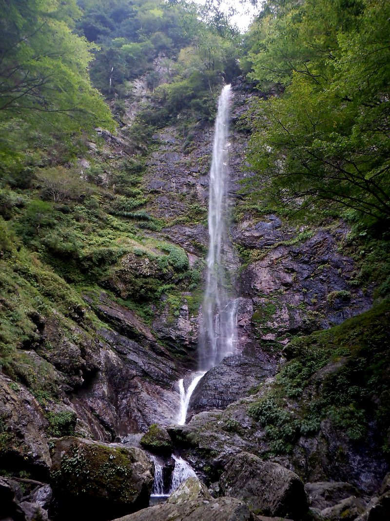 ネットで調べてみると黒色片岩と呼ばれる変成岩の一種のようだ。確かに大部分の滝を構成している岩石は黒っぽく,暗い谷をさらに暗くしている。