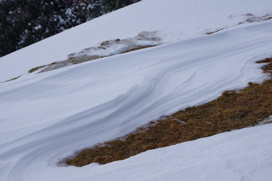 新たに降った雪でこうなったのか、強風で残雪が移動して形成されたのかは判らないけれど。