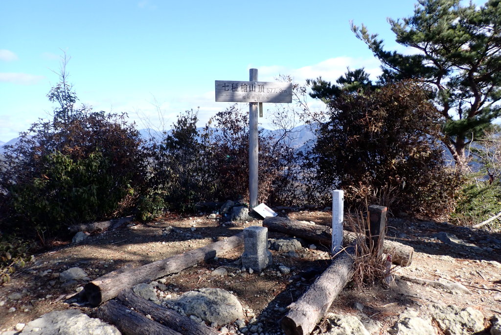 なんとか577mの七種槍に到着。山頂自体は遠目に見るのと違って立ち木に囲まれた平凡な場所だ。
