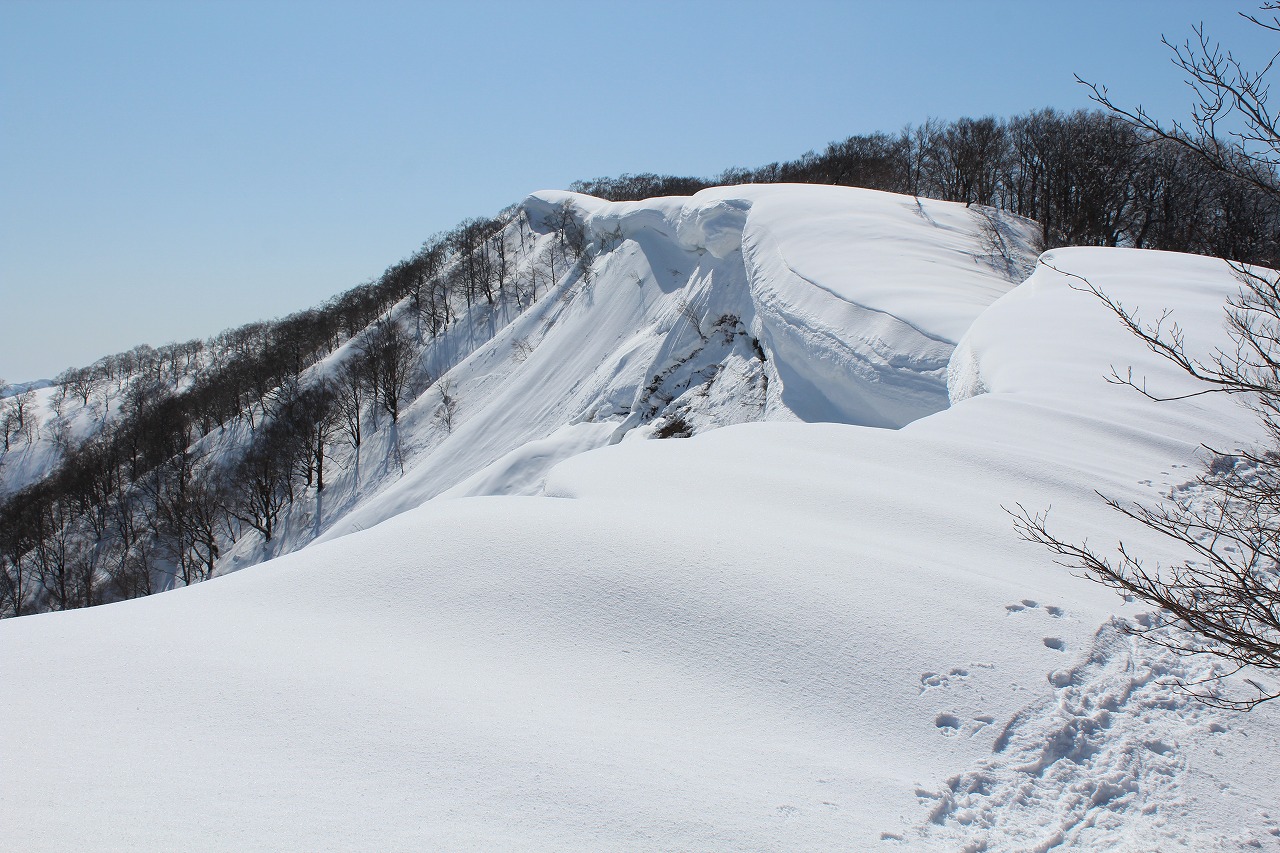 傾斜を登りきり、なだらかな雪庇稜線に上がった。
