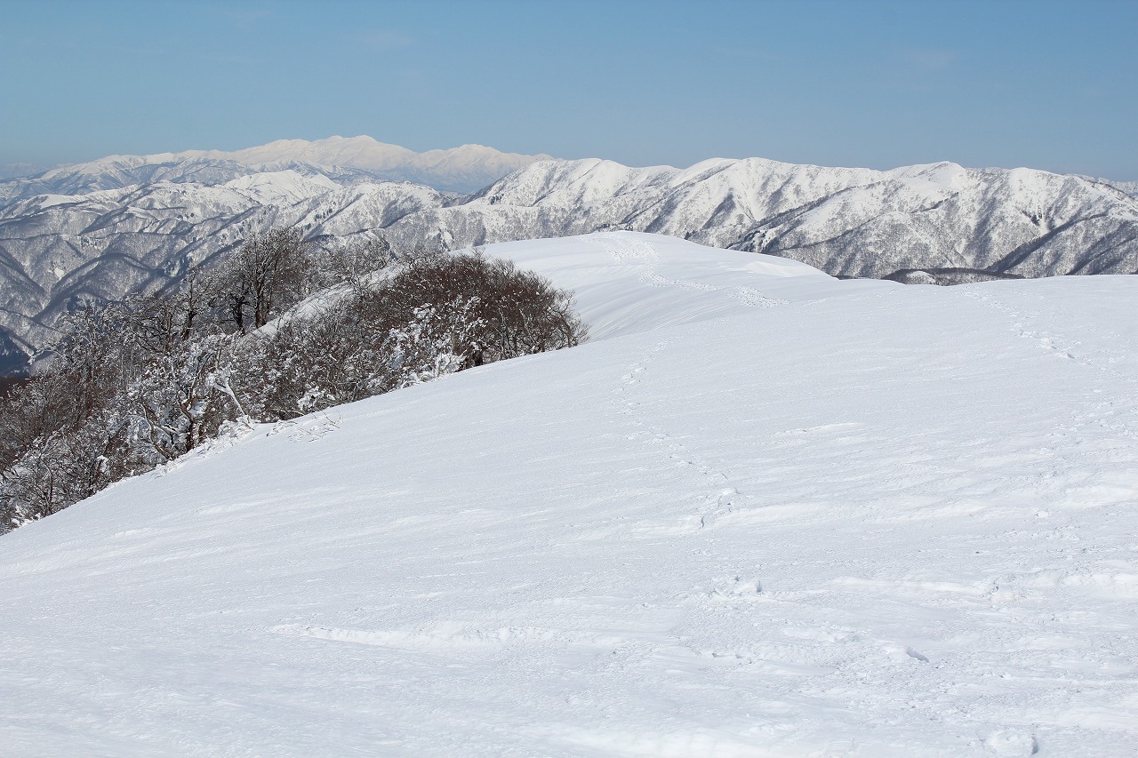 国境稜線の山並みの向こうには一段と白い白山が見える。