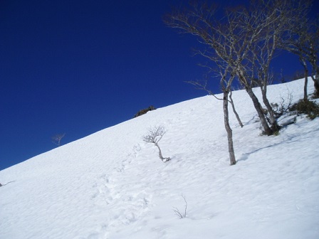 ジワジワ標高を上げて眼前に東雨乞の左肩が迫ってきた。あそこに着けば東雨乞に着いたようなものだ。ピーカンお天気の元で白銀の雪が際立つ。天上の楽園は上機嫌で向かい入れてくれた。