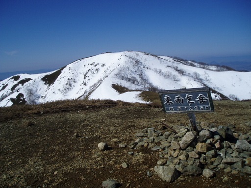 10時24分東雨乞岳に到着した。本峰の方まで行く時間はありそうだが、スキーで滑れる距離は僅かなので今回も本峰は省略して東峰から滑降を開始する。